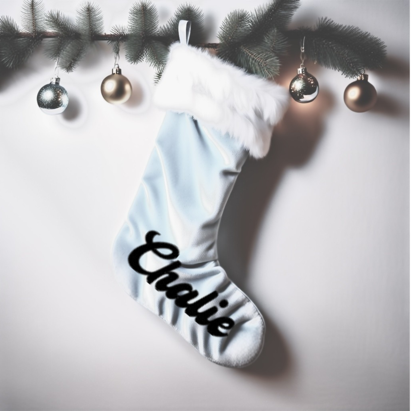 Bring some extra cheer to your holidays with the LUX SANTA STOCKING! Made of baby blue velvet and adorned with plush white fluff, this fully lined stocking can be personalized with your name for a special touch. A must-have addition to your Christmas decorations. Get yours now!