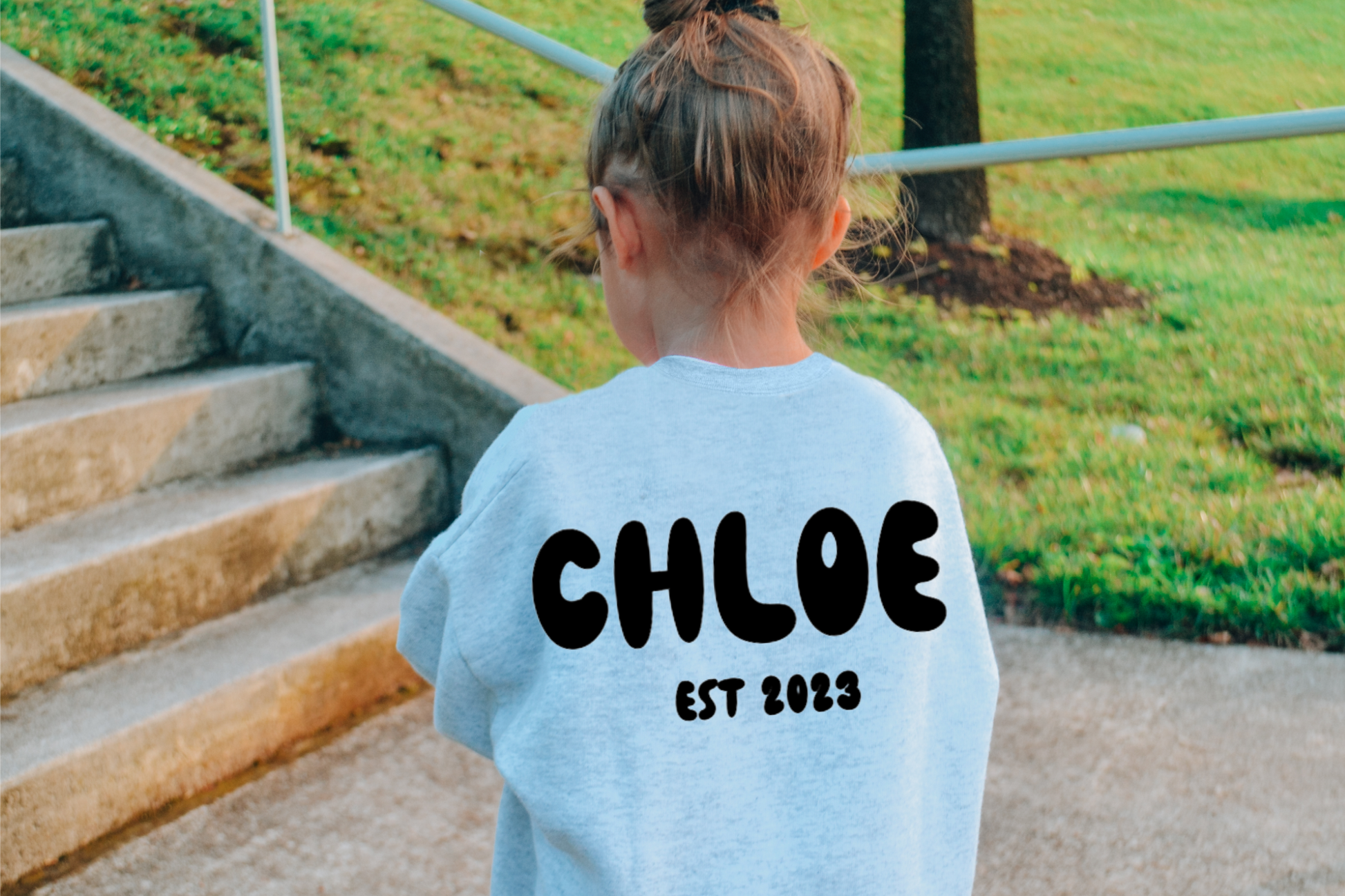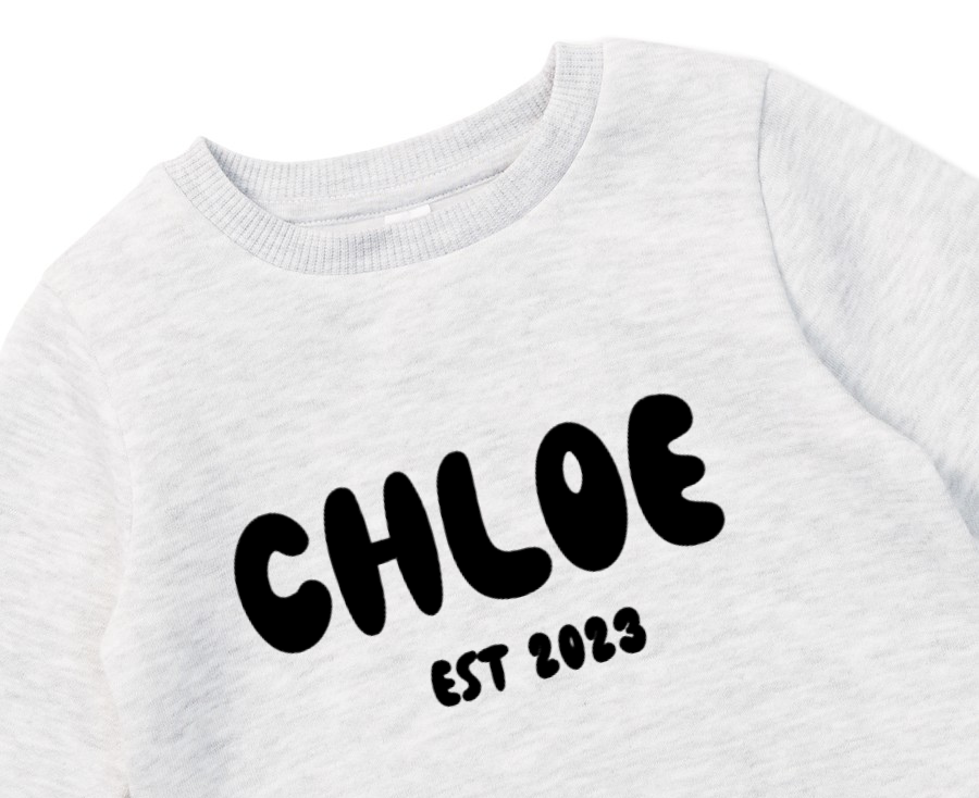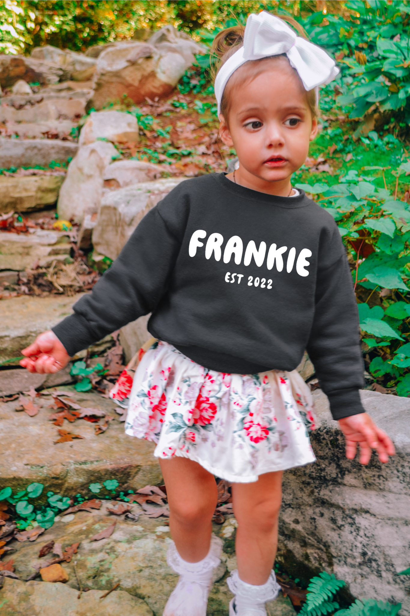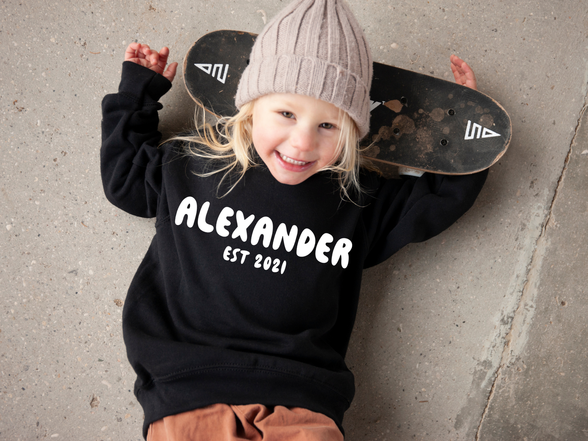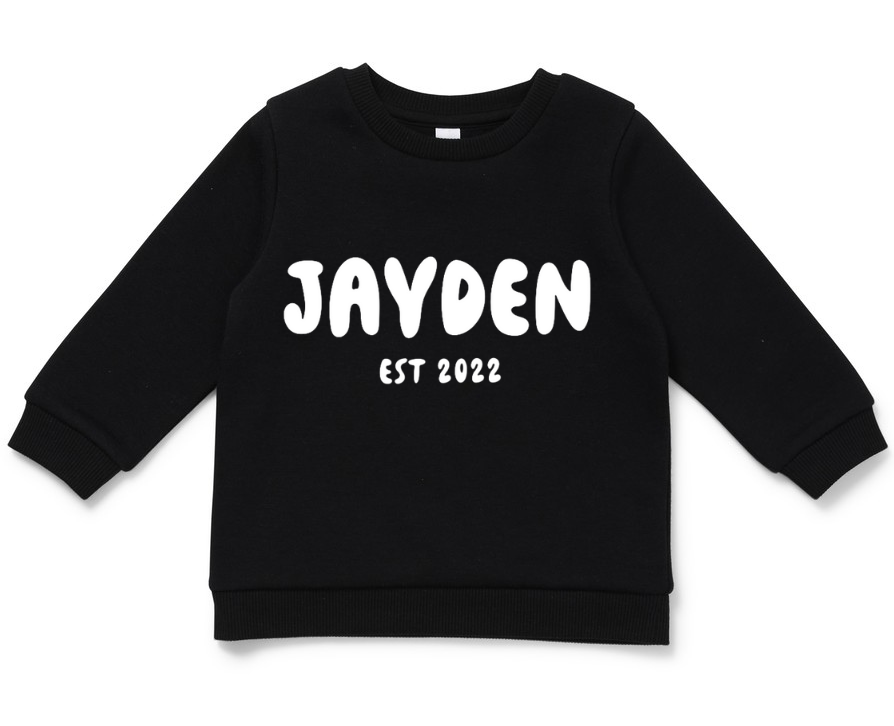 This cool BUBBLE NAME & EST SWEATSHIRT will add some serious swag to your little one's outfits! Personalized with their name and birth year in bubble font, it's a great way to show off your kiddo's cool style - available printed on the front or back.