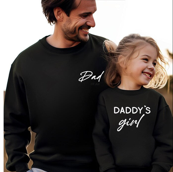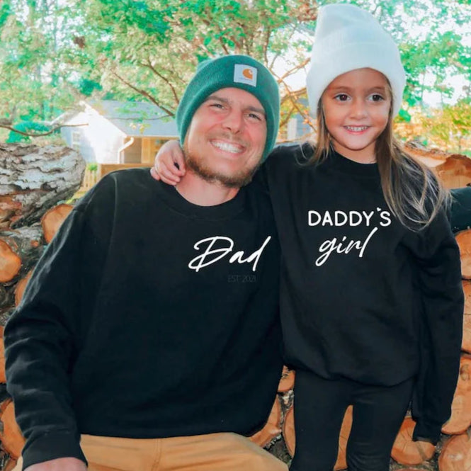 Twinning has never been more adorable! This charming duo features a custom dad sweatshirt showcasing his parenting debut year, paired with a mini version for his little sidekick proudly declaring their "daddy's girl/boy" status. The perfect combo for those special father-child moments!
