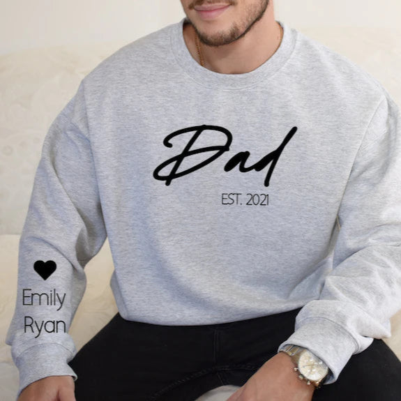 A playful twist on the classic sweatshirt, specially designed for dads! Featuring "EST." followed by the year he became a superhero, with his little terrors' names proudly displayed on the sleeve. The perfect way for Dad to wear his greatest achievement while staying cozy and stylish. Makes a heartwarming gift he'll actually want to wear!