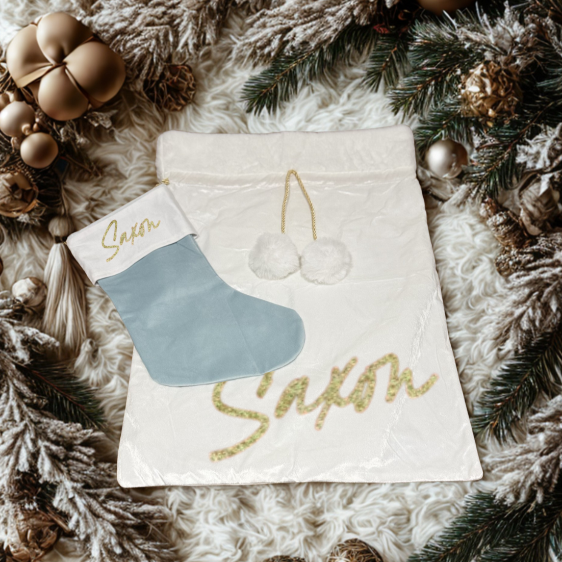 This personalised Christmas sack is crafted from rich velvet with a plush faux fur top decorated with cute pom poms. It features a stunning gold rope drawstring, custom-printed with your name for a festive flair.