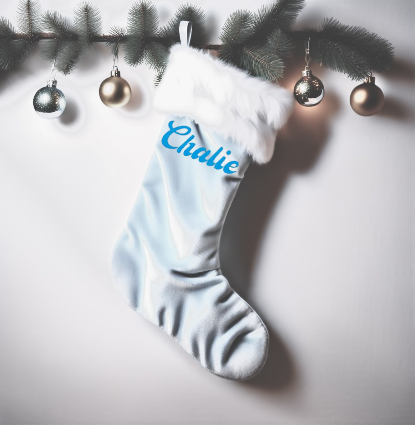 Bring some extra cheer to your holidays with the LUX SANTA STOCKING! Made of stunning baby blue velvet and adorned with plush white fluff, this fully lined stocking can be personalized with your name for a special touch. A must-have addition to your Christmas decorations. Get yours now!