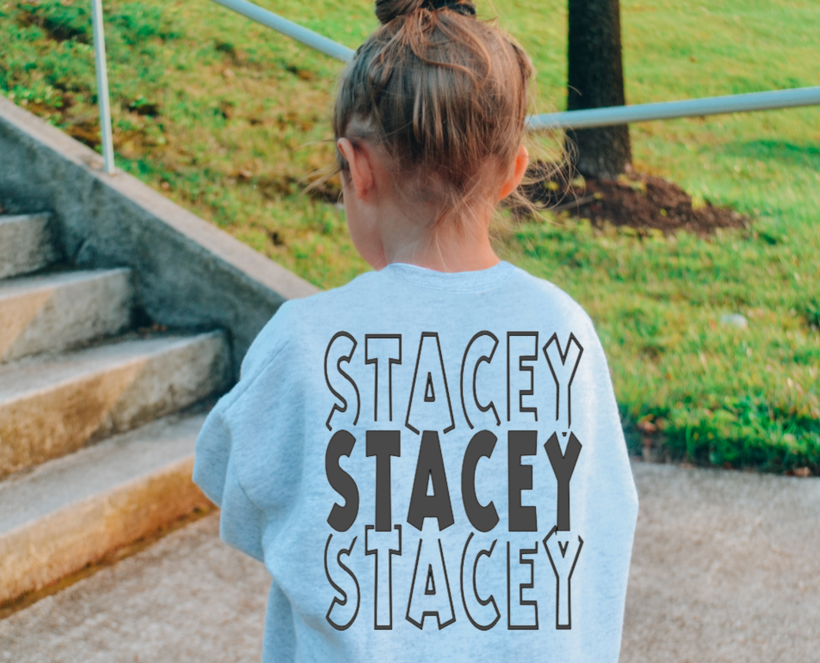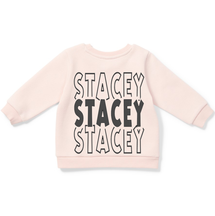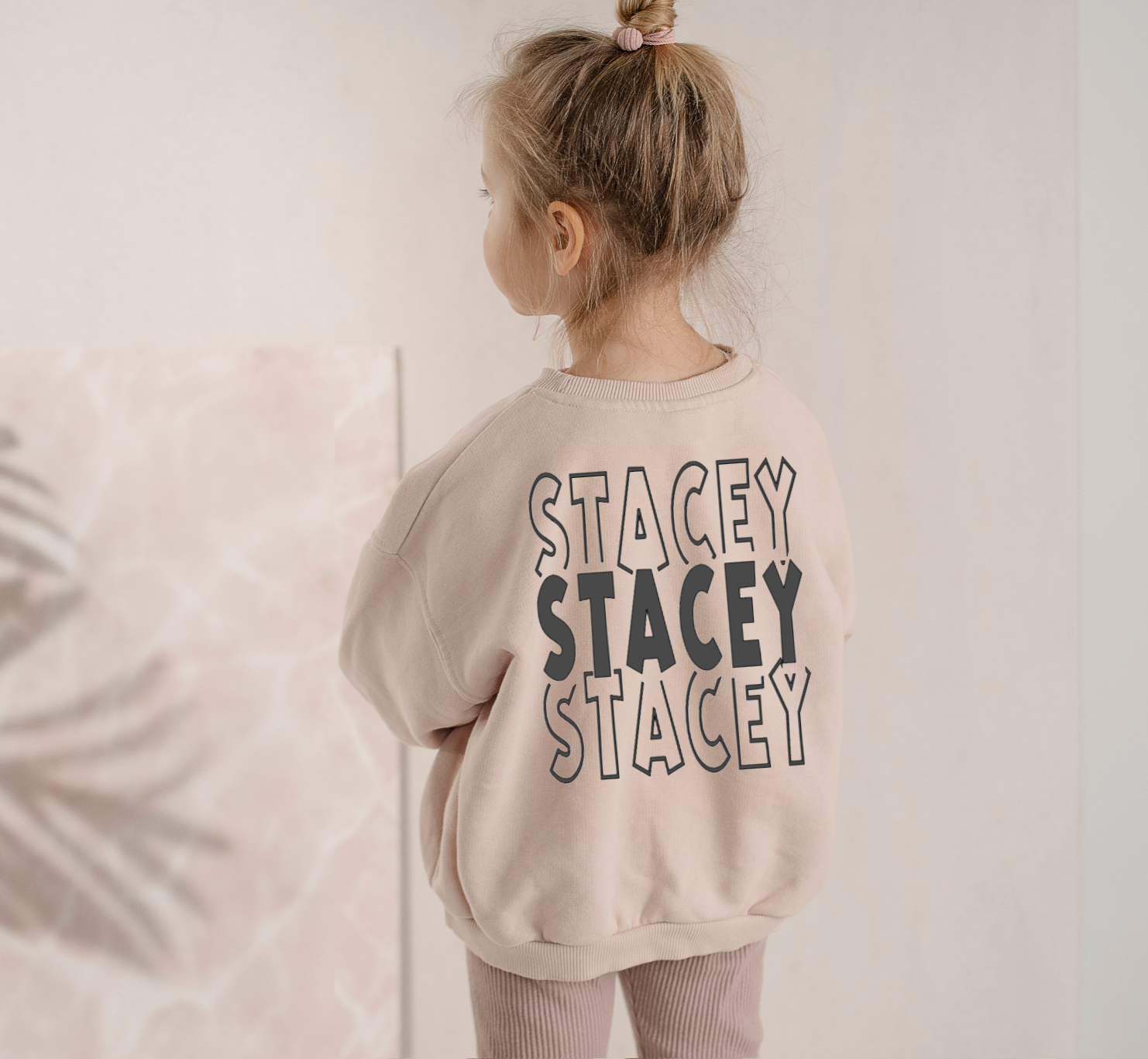 Our Repeat Name Sweatshirt stands out with a bold, repeated name design, offering a fun and individualized style. Perfect for your little one, the back of this comfortable sweatshirt features their name printed in a distinct repeat style – a one-of-a-kind, eye-catching combination of fashion and comfort. Make a statement with the Repeat Name Sweatshirt!