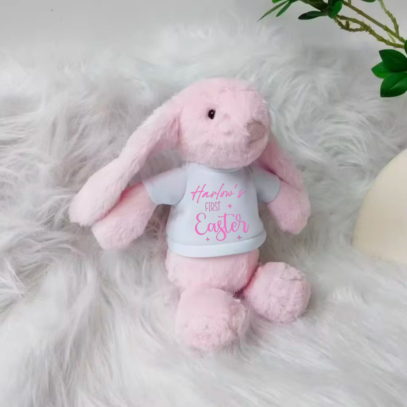 - Personalised Name printed on the bunny's white T-shirt