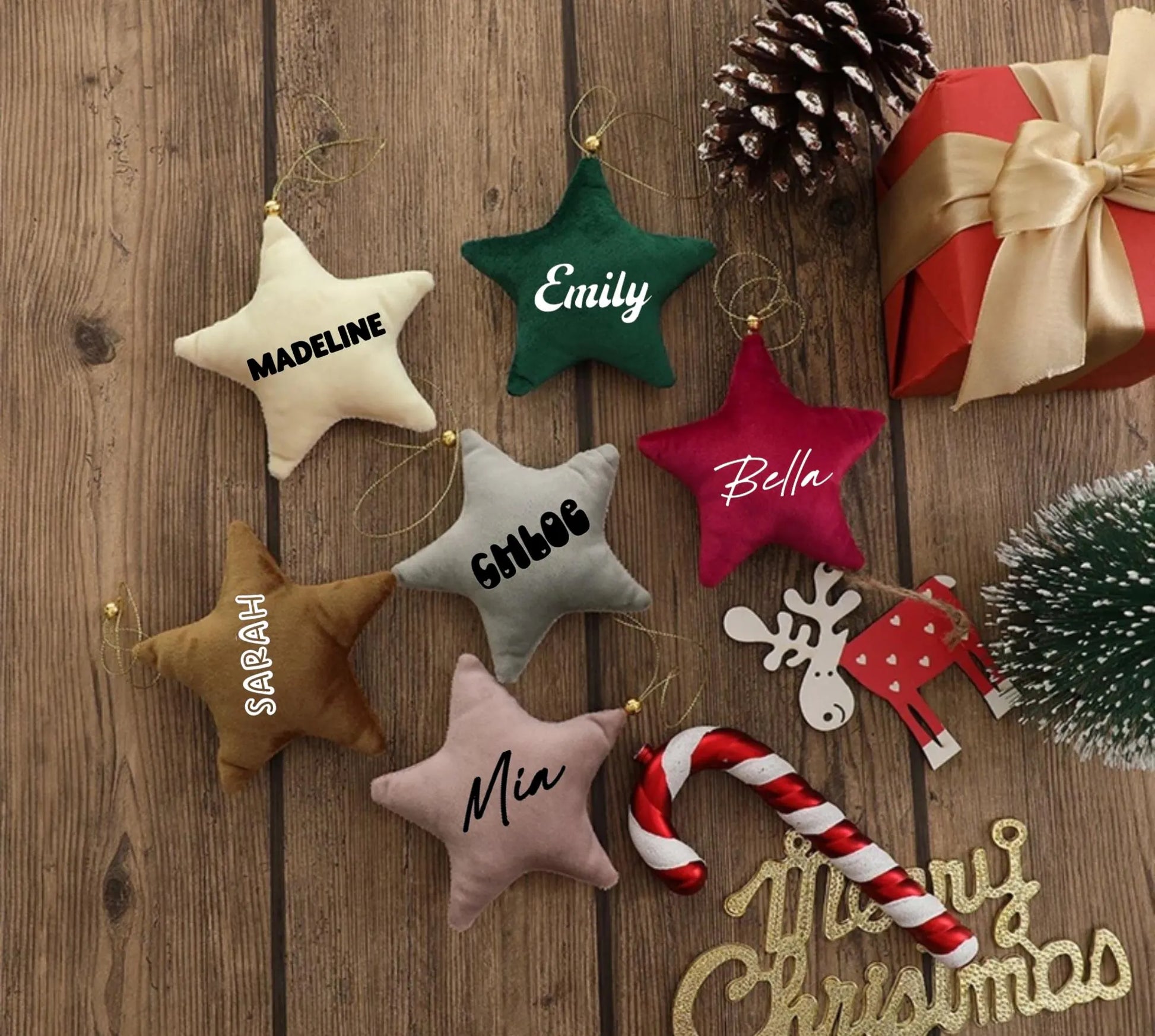 Add a touch of festive flair with our VELVET STAR - NAME. Made of plush velvet, this Christmas decoration star features your name printed on it. Perfect for adding a personal touch to your holiday decor. Festive, fun, and oh-so-soft, this star will make your home merry and bright!